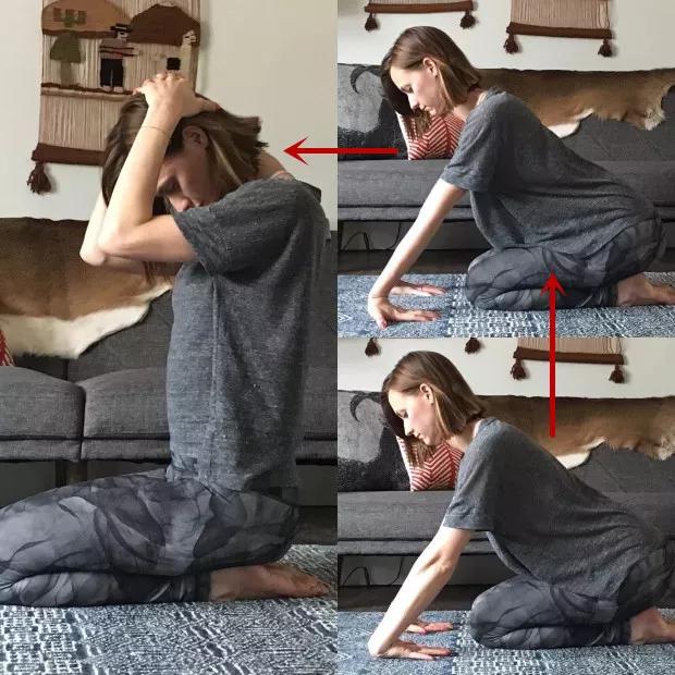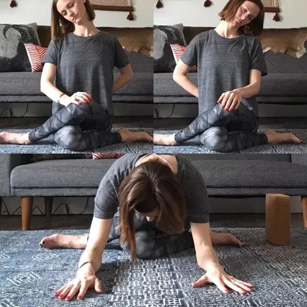 越来越多的研究发现久坐的人,患心脑血管疾病、糖尿病以及癌症等的的风险都会增加。今天给大家介绍一套动作,能有效缓解久坐带来的危害。 1 立在垫面上,双脚并拢,脚背贴地,臀部坐在脚后跟上; 双臂向前伸展,手臂外旋,手掌向上,手背放在地板上,保持1-2分钟; 然后伸展手腕,翻转手臂,手掌朝下,脉门朝前,放在地上,保持1-2分钟; 收回手臂,双手抱住头部后侧,下巴慢慢地找向锁骨,保持呼吸并慢慢地将颈部向侧面和背部进行拉伸。 2 面向沙发或椅子跪立,双脚打开略大于髋部,脚背贴地,臀部坐向脚后跟; 双手和肩背部向前伸展,手放在高于肩膀的地方,头部和肩部慢慢沉下去,至最大限度,保持1-3分钟。 有肩部或脊柱疾病的朋友们要量力而行,千万不要拉伤自己,最好在医生的指导下练习。 3 坐姿准备,左脚在上,右脚在下,分别弯曲双膝,靠向左侧和右侧臀部边缘,膝盖叠在一起; 坐直,左手放在下腰部,另一只手放在膝盖上,延展脊柱,将右耳慢慢贴向右肩,保持1分钟,回复中位,然后将左耳慢慢贴向左肩,保持1分钟; 呼气,前屈身体向前向下,两手臂向前伸展,保持1分钟,双腿换另一侧练习。 其实,应对久坐最简单的一招就是多站起来活动。 锻炼康复,贵在坚持。坚持下去,你练的每一个动作都不会辜负你。