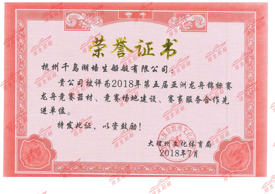2018年第五届亚洲龙舟锦标赛荣誉证书