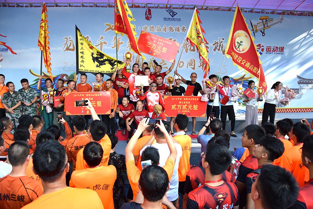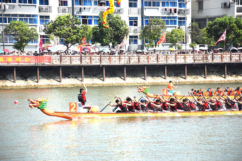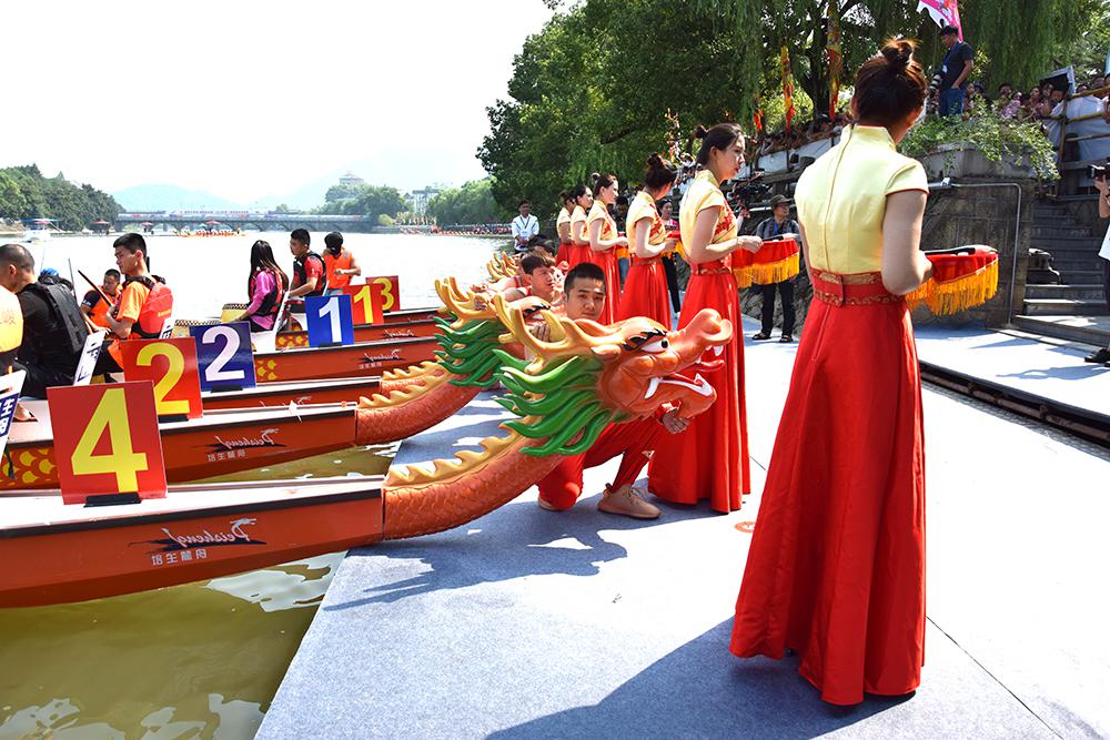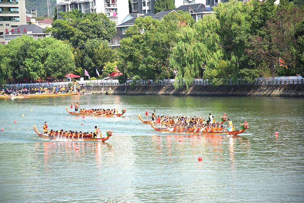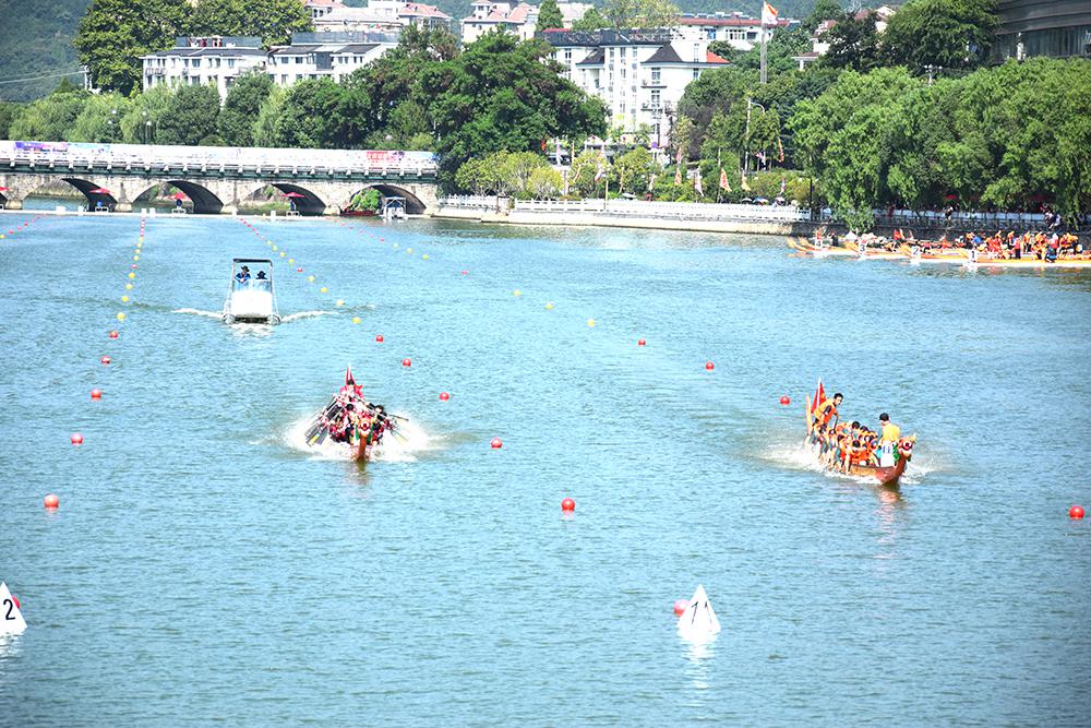 仲夏过后,炎热的气息还未从寿昌古镇完全消散,龙腾千年镇,舟跃航空城——庆祝新中国成立70周年,2019中国·建德龙舟邀请赛于9月8日在这里拉开帷幕,打开了人们对千年古镇的传统记忆。 赛事由中国龙舟协会指导,建德市人民政府、浙江省龙舟协会、浙江省船艇协会主办,建德经济开发区(航空小镇)管委会、寿昌镇人民政府、建德市文化和广电旅游体育局承办,杭州千岛湖培生船艇有限公司提供本次器材服务、技术服务。 来自福建、湖北、安徽、江西、上海、江苏、北京、广东、浙江八个省以及建德本地四只龙舟参赛队共312名运动员齐聚寿昌江边,他们将在这座千年古镇前一展风采。浙江省水上运动管理中心主任孟关良;市委副书记吕平;建德市常委尤荣福;建德市常委、宣传部长朱春根;建德市人大常委副主任童文扬;建德市副市长郑志华;建德市政协副主席严凌云出席本次比赛,并为参赛龙舟点睛。 龙舟作为我国最重要的节日民俗活动之一,以其雄壮的气势、悠久的历史、浓厚的文化内涵,被列入第三批国家级非物质文化遗产名录。今年恰逢新中国成立70周年,为进一步弘扬中华民族优秀传统文化,传播民俗文化精神,充分展示建德深厚的文化历史底蕴和生态自然环境,彰显最宜居城市的独特魅力,提升建德的知名度和美誉度,促进旅游发展和文化与体育交流,真正实现旅游+文化+体育的完美融合。 “龙舟又荡旧时波,锣鼓频催破浪梭。”激烈的鼓点声,各队参赛队员们的激情,点燃了两岸观众的热情,观赛群众不断为参赛队员们加油鼓劲。听得鼓号一响,龙舟上两排人马齐心协力奋力划桨击水,争先恐后破浪向前,寿昌江中水花四溅,寿昌江岸人潮沸腾,古镇随着人们的欢腾热闹了起来。