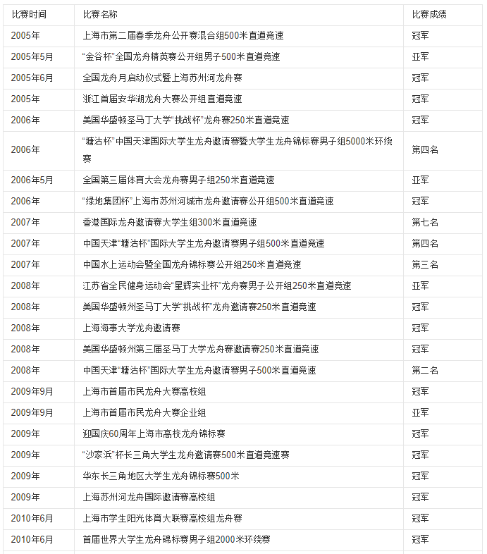 上海海事大学龙舟队成立于2000年10月,是一支组织纪律严明、训练刻苦、作风顽强和团结的高水平运动队,在日常的训练和管理中强调自我管理、自觉锻炼、挑战自我,互帮互学、勇于拼搏、不断进龋龙舟队成立至今已多次参加了国际、国内和上海本地区的高水平龙舟大赛,并屡获佳绩。 发展 在2003年中国天津国际大学生龙舟邀请赛的5000米环绕赛中,上海海事大学龙舟队主动暂停正在进行的比赛,吕少群教练奋不顾身跃入海中,勇救美国哈佛大学落水的舵手,赢得各参赛队和观众的尊敬及大赛组委会的好评。2006年,“上海海事大学龙舟队”作为中国高校首支赴美参赛的龙舟队,在美国华盛顿州“挑战杯”龙舟赛中,经过奋力拚搏勇夺冠军。 荣誉 2005年天津“塘沽杯”国际大学生龙舟邀请赛获男子组500米、混合组500米直道竞速第五名和第六名 2005年5月全国龙舟精英赛男子公开组直道竞速500米第二名 2005年6月全国龙舟月启动仪式暨上海苏州河龙舟赛第一名 2006年5月全国体育运动会龙舟男子组直道竞速250米比赛第二名 2007年首届中国水上运动会250米公开组的第三名 2007年“星辉实业杯”中国沙家浜江浙沪龙舟邀请赛第二名 2008年美国华盛顿圣马丁大学龙舟邀请赛:男子组250米第一名 2008年天津“国际大学生龙舟邀请赛”:男子500米直道竞速第二名 2009年上海苏州河龙舟国际邀请赛 高校组第一名 2009年5月美国华盛顿州“挑战杯”龙舟赛,上海海事大学龙舟队获第一名 2009年9月19日,上海市首届市民龙舟大赛中,夺得高校组的第一名,上海市企业组第二名。 2009年上海市高校龙舟锦标赛 第一名 2009年长三角大学生龙舟邀请赛第一名 2010年6月5日,上海市学生阳光体育大联赛高校组龙舟比赛冠军。 2010年6月15日至16日,首届世界大学生龙舟锦标赛,上海海事大学龙舟代表队荣获男子组2000米环绕赛冠军,直道竞速200米第二名,直道竞速500米第五名。 2010年6月三峡坝区全国龙舟邀请赛,上海海事大学龙舟代表队荣获标准龙舟500米的直道竞速,获得第二名。 2012年6月23日获得第三届世界大学生龙舟锦标赛男子组200米直道竞速的世界冠军。 2012年6月23号上海苏州河龙舟赛冠军。 2012年6月24日上海市民龙舟赛小龙男子组200米冠军。 2012年6月24日上海市民龙舟赛小龙男子组500米亚军。 2012年6月24日上海市民龙舟赛混合小龙200米,500米冠军。 2012年6月24日上海市民龙舟赛混合大龙500米冠军。 2012年6月30日上海市第一届市民龙舟赛500米冠军。 2012年7月8日获得中国龙舟公开赛昆山站200米第五名。 2 012年7月8日获得中国龙舟公开赛昆山站500米第六名。 2012年7月8日获得中国龙舟公开赛昆山站5000米第七名。 2012年7月8日获得中国龙舟公开赛昆山站总成绩第七名。 2013年6月“中天杯”第一届上海—新北龙舟交流赛第四名。 2013年6月“万泽杯”中国龙舟公开赛(武进站)男子组23人龙舟500米直道竞速第四名。 2013年6月第四届世界大学生龙舟锦标赛男子组直道竞速200米第一名。 2013年6月第四届世界大学生龙舟锦标赛男子组直道竞速2000米第一名。 2014年4月中华龙舟大赛常州武进站大学生女子组12人小龙舟总成绩第三名。 2015年4月美国华盛顿州第十届圣马丁大学龙舟赛邀请赛250米混合龙舟冠军。 上海海事大学龙舟队简介 上海海事大学龙舟队成立于2000年10月,其队员全部来自于校内各年级各专业的学生,是一支真正意义上的大学生运动队。它是一支组织纪律严明、训练刻苦、作风顽强的高水平运动队,在日常的训练和管理中强调自我管理、自觉锻炼、互帮互学,并提倡挑战自我、不断进取和勇于拼搏的精神。2005年底,上海海事大学龙舟队被教育部批准为全国高校高水平运动队。 上海海事大学龙舟队的竞技水平一直处于上海市第一,全国前列的水平。上海海事大学龙舟队成立至今已多次参加了国际、国内和上海本地区的高水平龙舟大赛,并屡获佳绩。上海海事大学龙舟队参加了三届中国国内最高水平的龙舟赛事——“屈原杯”全国龙舟锦标赛,共获11面金牌,并受国家体育总局指派参加第八届世界龙舟锦标赛。特别是我校龙舟队在2006年和2008年以及2015年参加美国华盛顿洲圣马丁大学“挑战杯”龙舟赛三次问鼎冠军,为国家争得了荣誉,也为上海海事大学争了光。 现将上海海事大学龙舟队近年来参加的省级以上比赛及获奖情况简列如下: 表1.上海海事大学龙舟队近年来取得的成绩