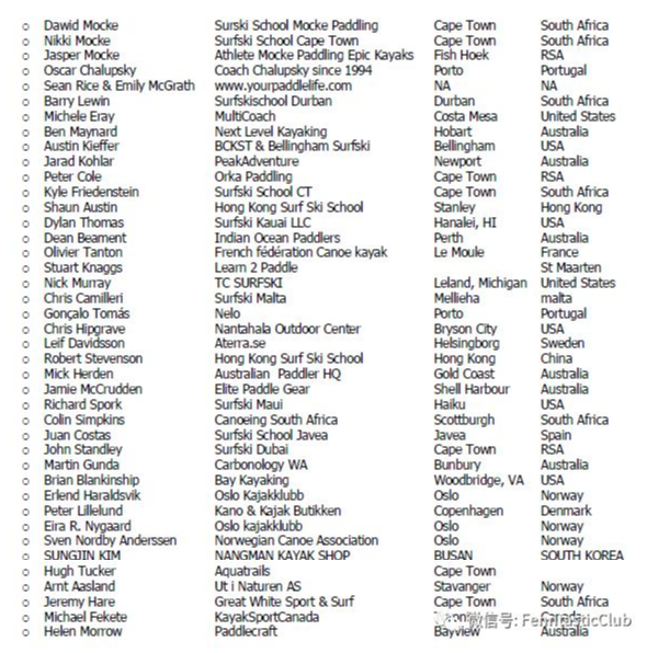 关于主编 大卫墨客(Dawid MOCKE)是来自南非的世界冠军。他曾代表他的国家参加冲浪救生、皮划艇马拉松和静水竞速项目,在2009-2012年间四次夺冠。他于2002年创办冲浪艇学校,此后曾为数千名冲浪运动员提供专业训练。近20年来,活跃在各大国际赛事和世界海洋皮划艇系列赛中指导并执教。 图为Dawid MOCKE 和儿子 贡献者名单 以下是本文的参与者列表。这不是一个完整的名单,因为有一些贡献者没有分享他们的具体信息。只要浏览一下这个列表,就会发现收集到的数据来自于海洋皮划艇(冲浪艇)运动目前最有经验的桨手和教练。 相关阅读: