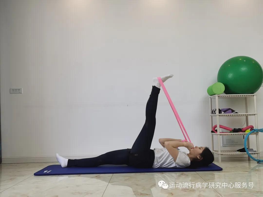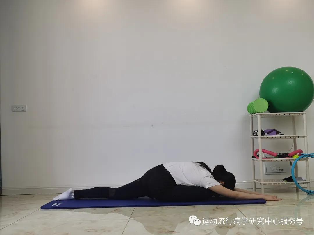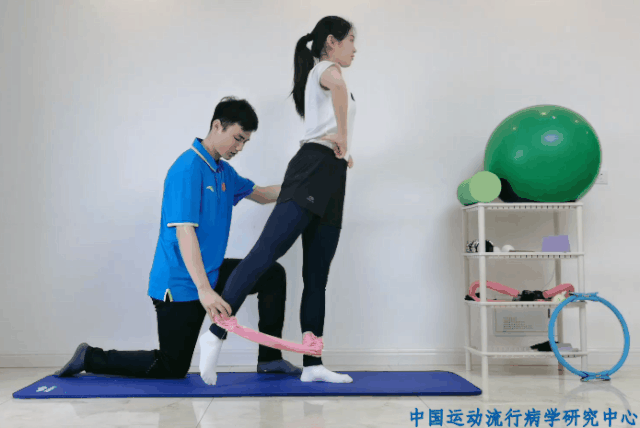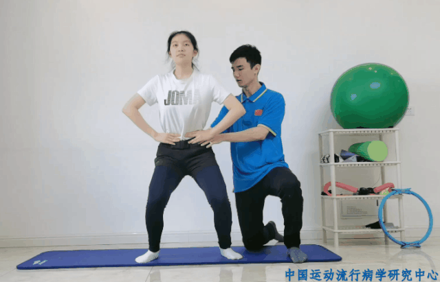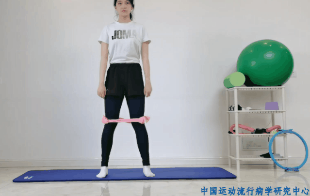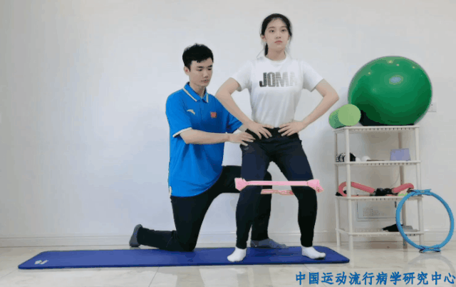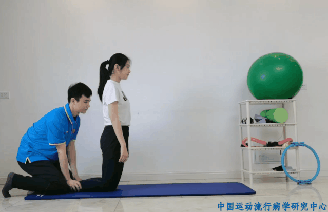 肌肉激活 (3min) 受试者在覆辙弹力带的情况下自主进行深蹲动作。 动作练习 以下动作练习负荷 4sec/week,28min,14sec×3set 股二头肌 受试者跪立于垫上,指导者在提后双手固定其脚踝,吸气时受试者身体前倾下落,下落过程打开手臂,做一个肘撑动作,呼气时双手推臂,用大腿前侧肌肉的力量带动身体上抬,受试者要保持动作的连贯性。 蹲跳 指导者跪立于受试者体后,当受试者进行蹲跳时,语言提示其腰部要立直,下落时屈膝。 后抬腿 指导者跪立于受试者体后,当其大腿后抬时,辅助其核心肌肉收紧,受试者身体尽量不要晃动。 横向走 指导者跪立于受试者体后,当受试者进行横向走时,提示其腰部要立直,膝盖的位置不超过脚尖。 整理放松 (5min) 臀肌 股二头肌 转载自 运动流行病学研究中心服务号